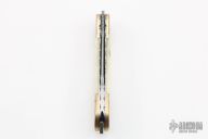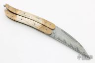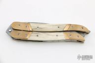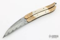 The Balisong by Corrie Schoeman, features a wharncliffe Damascus blade with a false top edge, fileworked spine and under ricasso. The handle has carved two-tone bronze bolsters, giraffe bone scales, fileworked titanium liners, two-tone anodized titanium backspacers, Damascus T-latch with filework. Rides on Teflon washers. Comes with COA dated August 2020. New from maker.