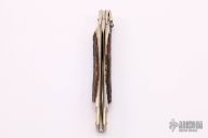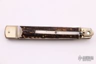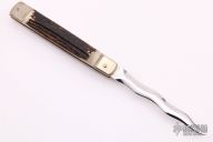 This leverlock auto by Hubertus features a mirror polished Kris style blade, edges are unsharpened, nickel silver double bolsters, stag scales, and brass liners. Opens with a nice snap. No blade play. Has some light scratches, otherwise excellent condition.