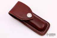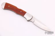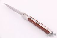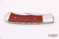 This Buck 532 features a satin finished blade with nail nick. The handle has a fileworked stainless steel frame and bolsters with wood inlays and stainless steel spring. Comes with original leather sheath. Has some light scratches, otherwise excellent condition.