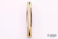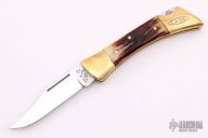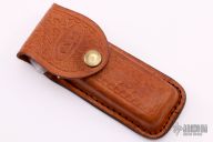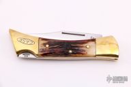 This lockback folder features a mirror finished clip point blade with nail nick. The handle has brass bolsters, front and rear, brass liners, and India red stag scales. Comes with a brown leather sheath, has original box. Has some light scratches, otherwise excellent condition.