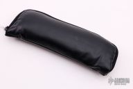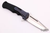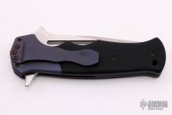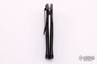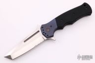 This Tank flipper by Crawford Knives features a satin finished tanto partially serrated blade with notched thumbrest and flipper and has fullers. The handle has bead blasted dovetailed and anodized titanium bolsters, black linen micarta scales, bead blasted and anodized titanium liners, black linen micarta backspacer, tip down bead blasted and anodized titanium clip. Blasted and bronzed hardware. Comes with zippered case. Nice detent, lockup and blade seating. Excellent condition.