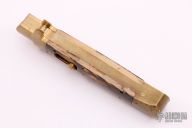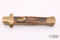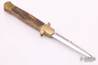 This Italian Stiletto OTF by Paul Panak has a mirror finish on a hollow ground, double-edged spear point blade. Chassis is brass with a brass thumbslide, mammoth ivory scales. Blade deploys with authority and locks up tight with minimal blade play. Has a little patina on the brass, some scuffs and scratches, and a couple dings, otherwise good condition. Comes with a zippered case.