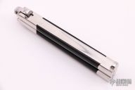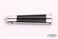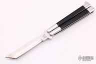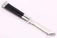 This early tanto balisong features a Jody Samson ground satin finished tanto blade. The handles are mirror polished stainless steel with black linen micarta inlays. Comes with a zippered case. Has some light scratches, otherwise excellent condition.