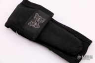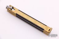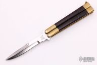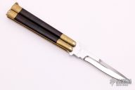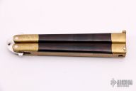 This Balisong features a double-edged blade ground by Jody Samson. The handle is comprised of integral dovetailed brass handles with maroon linen micarta inlays. Brass T latch on pommel. Some discoloration on the brass and some light scratches, the knife is in excellent condition. Includes original Velcro sheath.