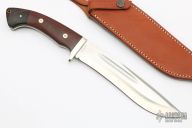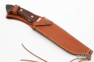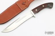 This camp knife by AG Russell features a satin finished blade with a fullers, .223" blade stock and 1.466" blade depth, full tapered tang construction. The handle has nickel silver guard, and red micarta scales with black spacers/liners and a wood butt with lanyard hole. Comes with original brown leather sheath. The blade has a few light scratches, otherwise excellent condition.