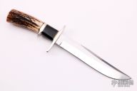 This Model 7 Sub-Hilt (1993) was made by Bob Dozier for AG Russell under the Morseth Patent. It has a satin finished clip point blade with a nearly sharpened top edge, hidden tang construction, .178" blade stock and 1.141" blade depth. The handle has a nickel silver guard and sub-hilt, stag grip and black/brass/wood spacers. Comes with a zippered case. Excellent condition.