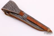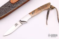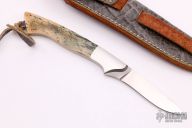This fixed blade from Pete Forthofer features a drop point hand rub satin finish blade, .133" blade stock and .622" blade depth, full tapered tang construction. The handle is comprised of dovetailed stainless steel bolsters and mammoth ivory scales. Includes leather sheath with belt loop. One of the scales is separated from the tang , otherwise good condition.