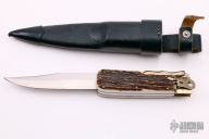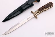 This Pig Sticker by Hubertus features a satin finished blade with mirror polished flats. The handle has a brass swing guard, bolsters and liners with stag scales. Comes with a green leather sheath. Has some light scratches, otherwise excellent condition.