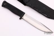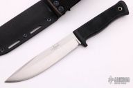 Model A1 is a semi-large all-purpose knife for heavy-duty use. The powerful blade is made of extremely hard yet tough VG10 steel and will withstand the stress of hard use. The knife is superb to chop with, but also works very well with daily tasks, thanks to the ergonomic grip. The full tang goes entirely through the handle, so you can strike the end of it without breaking the grip. The sturdy black kydex sheath allows you to fasten the knife on your belt or your pack - even upside down. Model A1 is a water repelling concept which works just as well in extreme cold as in stifling heat. Has scuffs and scratches, has been used, good user condition.