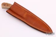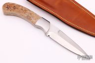 This Dagger by Ron Gaston features a hand rub satin finished double-edged blade. Satin finish dove tailed stainless steel bolsters with mammoth bone scales. Full tapered tang construction with 1.020" blade depth and .156" blade stock. Includes a brown leather sheath with clip. There are some scratches on bolsters, otherwise good condition.