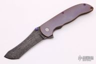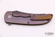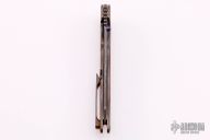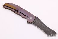 This Norseman (#3095) by John Grimsmo features an acid tumbled blade with a single anodized titanium thumb stud, notched thumb ramp and flipper. Anodized finished crosshatch milled titanium frame with anodized titanium screws. Very smooth action that requires no wrist movement. Nice detent, lockup and blade seating. Rides on ceramic bearings. Knife is in excellent condition, shows no signs of use or carry. Comes with original packaging, custom hard case, Nano-Oil, tool, and COA.