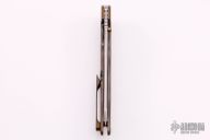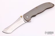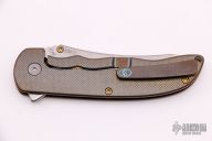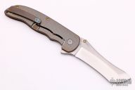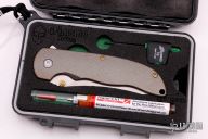 This Norseman (#3596) by John Grimsmo features a tumbled blade with a single anodized titanium thumb stud, notched thumb ramp and flipper. Anodized finished crosshatch milled titanium frame with anodized titanium screws. Very smooth action that requires no wrist movement. Nice detent, lockup and blade seating. Rides on ceramic bearings. Knife is in excellent condition, shows no signs of use or carry. Comes with original packaging, custom hard case, Nano-Oil, tool, and COA.