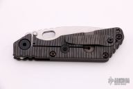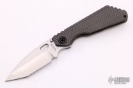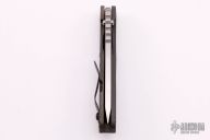 This MSC SNG framelock folder by Mick Strider features a stonewashed tanto blade and a dimple pattern Battleship grey aluminum and flamed titanium frame and tip up titanium clip. Includes Hinderer "Lock Bar Stabilizer" for maximum reverse lock retention. Nice detent, lockup and blade seating. Excellent condition.