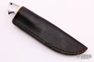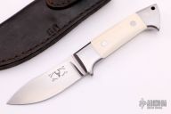 This integral Semi Skinner by Edmund Davidson features a hand rub satin finished hollow ground blade with notched thumbrest, .185" blade stock at the ricasso and 1.120" blade depth, integral construction with ivory inlays and a lanyard hole at the butt. Comes with a brown leather sheath. Has a few light scratches, otherwise excellent condition.