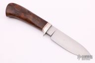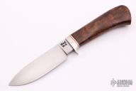 This Knife from Master Bladesmith John Fitch features a hand rub satin finished drop point, .210" blade stock and 1.310" blade depth, hidden tang construction. The handle is comprised of a nickel-silver guard with walnut grip with red/white/nickel silver spacers. Has some scratches on the b-side of the blade, otherwise excellent condition.