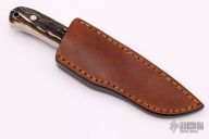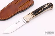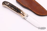 This Drop Point Hunter by Steve Johnson features a mirror polished blade, .125" blade thickness and .892" blade depth, full tapered tang construction. The handle has a nickel silver guard and stag scales. Mirror polished tang. Comes with a brown leather sheath. Great look and feel. Excellent fit and finish. Excellent condition.