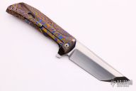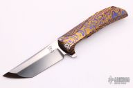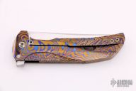 This Hogosha by John Barker and Peter Rassenti features a hand rub satin finished blade with flipper. The handle has an integral mokuti frame with matching tip up clip, frame and clip have been carved. Rides on bearings, nice detent, lockup and blade seating. Has a few very fine scratches on the frame, otherwise excellent condition.