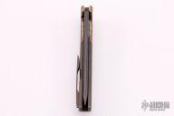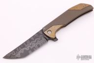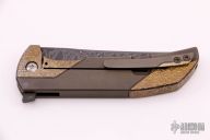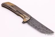 This Hogosha by John Barker and Peter Rassenti features a Damascus blade with flipper. The handle has an integral anodized titanium frame with matching tip up clip, frame and clip have been carved. Rides on bearings, nice detent, lockup and blade seating. Excellent condition.