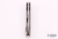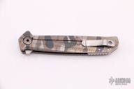 This Bomber Framelock Flipper by Ken Onion features a hand rub satin finished blade with notched thumbrest and flipper, blade has a beautiful simulated hamon. The handle has a laser engraved and anodized titanium frame with a titanium tip up clip and backspacer. Rides on bearings, nice detent, lockup and blade seating. Excellent condition.