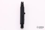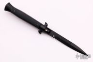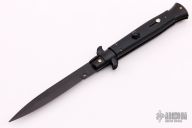 This Swivel Bolster Auto has a black stainless steel spear point blade. The handle is composed of a black steel front and rear bolsters, frame and liners all complemented by non-skid rubber scales. Excellent Condition.