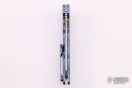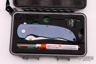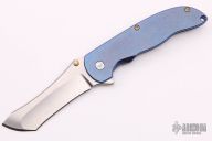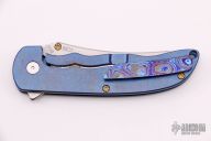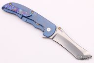 This Norseman (#2206) by John Grimsmo features a stonewashed blade with a single anodized titanium thumb stud, notched thumb ramp and flipper. Anodized finished titanium frame with anodized titanium screws. Has a custom Black Timascus clip with hidden screws, comes with original clip and screws. Very smooth action that requires no wrist movement. Nice detent, lockup and blade seating. Rides on ceramic bearings. Knife is in excellent condition, shows no signs of use or carry. Comes with original packaging, custom hard case, Nano-Oil, tool, and COA.