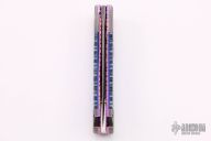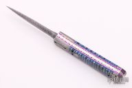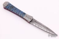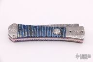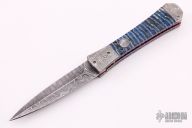 This Small Straight Dagger Auto by Kyle Vallotton features a Chad Nichols "Meadow" Stainless Damascus blade with false top edge. The handle has Chad Nichols "Train Tracks" Stainless Damascus bolsters and push button, blue mammoth tooth scales with blue G-10 liners, anodized and fileworked titanium liners, fileworked stainless steel backspacer. Nice lockup, action and blade seating. Comes with zippered case and COA. New from maker.