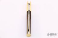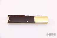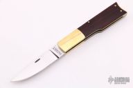 This Gunstock Slipjoint by Mike Bassney features a mirror polished blade with nail nick. The handle has dovetailed brass bolsters, wood scales, brass liners and butt plate, stainless steel spring. Has half-stop, flush in all positions. Has a few light scratches, otherwise excellent condition.