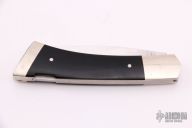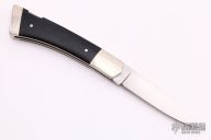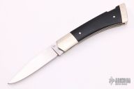 This lock back folder by LG Green features a hand rub satin finished blade. Nickel silver double bolsters with black linen micarta covers and nickel silver liners, stainless steel backspacer. Marked U.S.A. and 1983 on the inside of the frame. Nice function. Has some scrathces throughout, otherwise good condition.