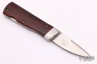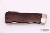 This Rolox Diamondback from Benchmark features a chisel ground, satin finish blade with swedge and cocobolo handle. Opening mechanism pushes blade up and out the front, then locks. Stainless steel liners and stainless steel bolster. Comes with original brown leather sheath, box and papers. Excellent condition.