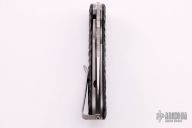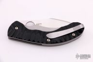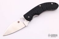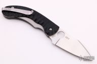 This Perrin PPT from Spyderco has a satin finished CPM S30V stainless steel drop point blade with thumb hole and notched thumb rest. Handle is black G10 over bead blasted stainless steel liners and backspacer. Bead blast stainless steel tip up clip. Has some scuffs and scratches, otherwise good condition.