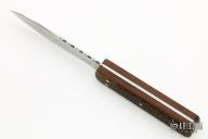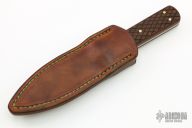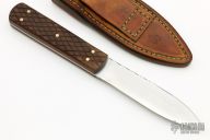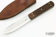 This Dadley by Paul Cooper features a satin finished blade with fileworked spine, .094" blade stock and .930" blade depth, full tang construction. The handle has checkered rosewood scales with brass pins. Comes with a brown leather sheath. New from maker.
