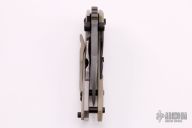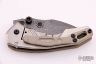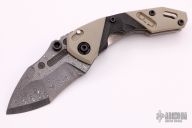 This Monitor framelock folder by Duane Carrillo features a Damascus tanto recurve blade with false top edge and dual thumbstuds. The handle has a tan G-10 front scale with carbon fiber inlay, and a satin finished titanium frame, tip up tan G-10 clip, and black standoffs. Nice detent, lockup and blade seating. Comes with a pelican case. Excellent condition.