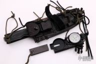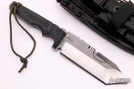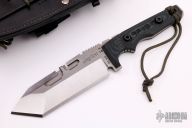 This Apache 13 by Dwaine Carrillo features a two-tone blade with satin grinds and bead blasted flats, notched thumbrest, .249" blade thickness and 2.072" blade depth. The top edge has a 1 3/4" sharpened surface and a wire cutter, full tang construction with  well contoured black/green G-10 scales. Includes a handmade Ukon LC1 full grain leather Survivor Rig with the following: a magnesium fire starter, a built-in ceramic sharpening rod, and a military-style Lensatic compass. The AirKat Apache is no longer in production by Dwaine Carrillo, and they are highly sought-after. The blade has a few light sheath marks, otherwise excellent condition. Comes with a zippered case.