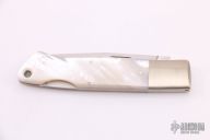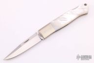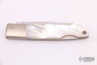 This Small Fighter lockback by Jess Horn features a hand rubbed satin finished clip point blade with false top edge and nail nick. Satin finished nickel silver bolsters and liners, mother of pearl scales, hand peened nickel silver pins, stainless steel spring, black linen micarta backspacer, and butt of handle has lanyard hole. It is a truly beautiful knife. Numbered 018. Comes with a leather zippered case. Excellent condition.