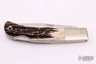 This stunning lockback folder from Jess Horn features a hand rubbed satin finished clip point blade with false top edge and nail nick. Satin finished nickel silver bolsters with beautiful stag scales, hand peened nickel silver pins, and nickel silver liners. Satin finished backspacer is stainless steel and black linen micarta, and butt of handle has lanyard hole. This beautiful piece is numbered #030 and is in excellent condition. This piece comes in a padded/zippered case.
