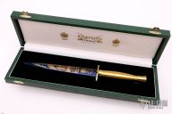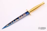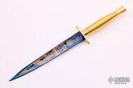 Wilkinson Sword Victory In The Falklands Commemorative Fairbairn Sykes (F.S.) Commando Knife, blue and gilt etched double-sided blade, one side etched with scene of Royal Marine standing by the raised Union Jack flag with Victory in the Falklands on a scroll and Wilkinson Sword trademark, other side of the blade is etched with a scene of soldiers in combat. Gold-plated one piece ribbed hilt. Housed in the original presentation box with printed quote from Major General Jeremy Moore and Wilkinson logo. Excellent condition.
