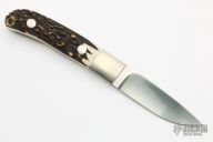 This knife by Yoshi Aida features a hand rub satin finished blade with .177" blade stock and .843" blade depth, full tapered tang construction. The handle has nickel silver bolsters, stag scales, lanyard hole. Comes with a zippered case. Excellent condition.