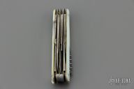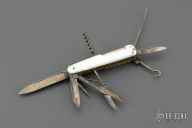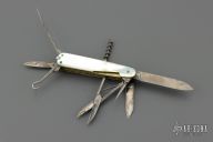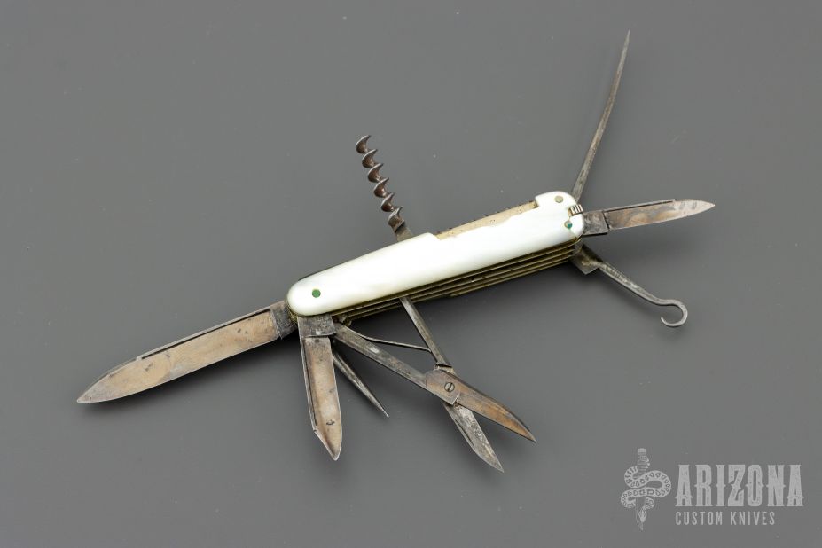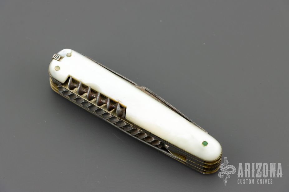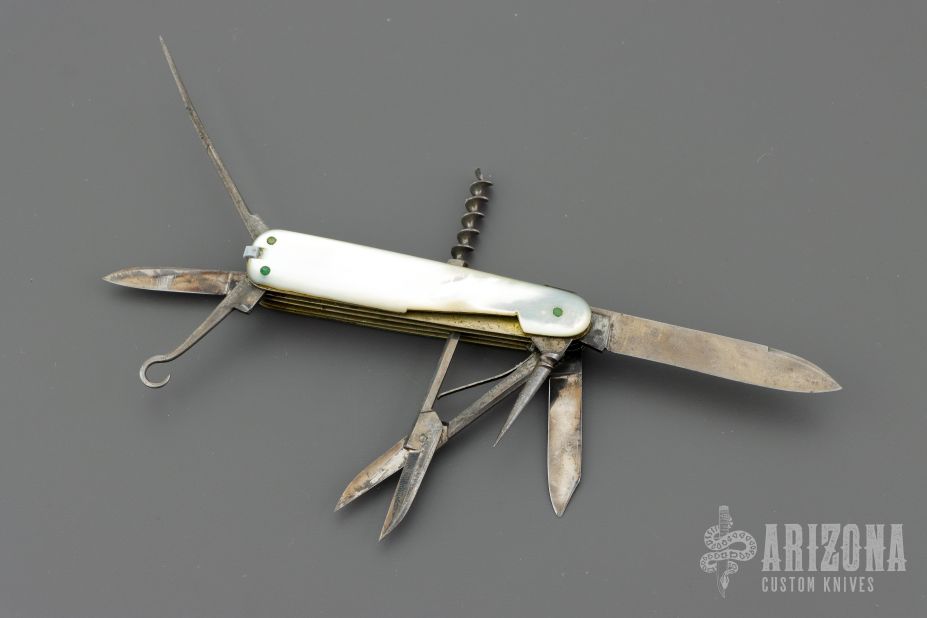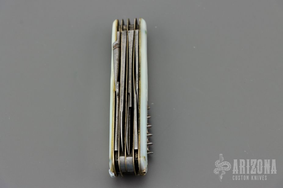 This antique slipjoint by WH Morley features 3 blades, scissors, short awl and long awl, corkscrew, button hook, nail file, tooth pick and tweezers (the tweezers have been replaced with a victorinox set). Has mother-of-pearl covers, coin edged nickel silver liners, steel springs. Has patina and scratches, but overall good condition for its age. Comes with a leather slip sheath.