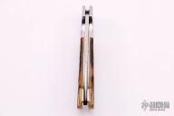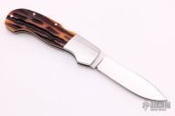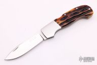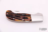 This lockback folder by LJ Thompson features a hand-rubbed satin finish blade with nail nick. The handle has dovetailed stainless steel bolsters and liners, jigged bone scales, stainless steel backspacer. Opens and closes with a nice snap. Nice blade seating and function. Has some light scratches, otherwise excellent condition.