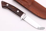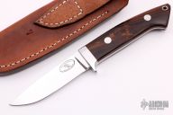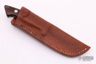 This Drop Point Hunter from Richard A. Rotella features a mirror polished blade. .192" Blade Stock. .944" Blade Depth. The handle is comprised of a stainless steel single guard and ironwood scales over red liners and full tapered tang construction. Lanyard tube in pommel. Includes leather sheath with "7" stamped on the back. Excellent condition.