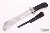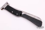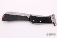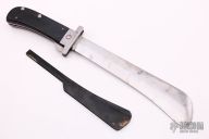 The folding machete consisted of a black Bakelite handle which was secured by a series of different size rivets. A locking mechanism is found in the handle. Pressing the lever allowed for the machete blade to be folded or unfolded. The blade is of single edge construction. it measures approximately 10 inches in length.