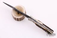 Chris Peterson is a renowned knifemaker based in Salina, Utah. He has over forty years of knifemaking experience and is an ABS Master Smith. Chris served in Vietnam where he learned the life saving importance of a good dependable knife. Chris forges all of his own steel and each knife blade he makes has 1200 layers of steel in it3. He uses O1 tool steel and A36 mild for his Damascus knives. He has also made knives with meteorite, although he hasn’t done so recently due to the high cost of production. Chris is a member of the organization of mountain men, known as the American Mountain Men, and carries the ensignia cartouche of "No Sweat" hense the branding of his knives. His brand is a encircled sweat drop with a slash through it. signifying "No Sweat" American Mountain Men is an association dedicated to preserving the traditions and ways of the nation’s greatest explorers and pioneers, the Mountain Men. The organization was started in 1968 by Walt Hayward. The American Mountain Men aim to conserve the nation’s remaining natural wilderness and wildlife, and to enable their members to survive alone, under any circumstances, using only what nature has to offer. They are interested in the quality of members, not the quantity, and their primary characteristic is to be a Brotherhood of Men. Members of the organization strive to teach, share, and learn the arts and skills of the original American mountain men. They also aim to embrace the total lifestyle of the original Mountain Men, researching all they can about these rugged individualists and then going into the field to practice what they have learned. They share their findings with other members through their magazine, "The Tomahawk & Long Rifle" The organization is not large, but it is worldwide. They work within the 1820 – 1840 era. The sense of camaraderie and the shared endeavor are more important to them than individual gain. As a member Chris will instruct interested parties in survival techniques in the wild. His son, Michael Peterson, also followed in his footsteps and became a bladesmith.