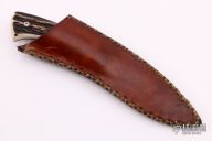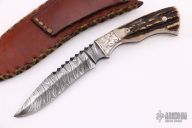 This knife by Chris Peterson features a Damascus blade with visible temper line, fileworked spine, .253" blade stock and .886" blade depth, full tapered tang construction. The handle has engraved nickel silver bolsters, stag scales with engraved nickel silver pins. Comes with a brown leather sheath. Has a nick in the blade edge and some light oxidation on the tang, otherwise good condition.
