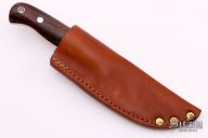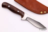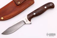 This hunter by Lynn Dawson features a satin finished drop point blade with fileworked spine and notched thumbrest, .163" blade stock and .914" blade depth, full tang construction. The handle has wood scales with stainless pins and lanyard hole. Comes with a brown leather sheath and zippered case. Excellent  condition.