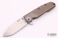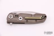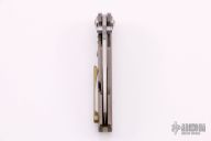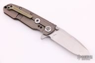 This Frame lock Flipper by Reate has a stonewashed S35VN drop point blade with dual thumb studs, flipper, and filed thumb rest. Handle is stonewashed and anodized titanium with stainless steel lock bar insert, manual lock safe system (preventing the lock bar from sliding to the open position, making this knife a virtual fixed blade), anodized titanium backspacer and tip up clip, and lanyard hole. Flips like a champ on caged bearings, dead center blade seating and rock solid lockup. Very nice work. Excellent condition. Comes with zippered case.
