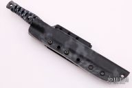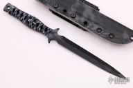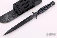 This dagger by Barry Dawson features an urban camo finished double-edged blade, .176" blade stock and .723" blade depth, full tang construction. The handle has black textured underlays with flat Paracord wrap, lanyard hole at the butt. Comes with a Kryptec kydex sheath. Excellent condition. Dated 2016 and #010