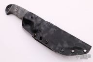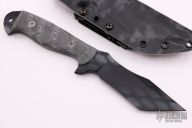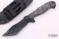 This Fighter by Barry Dawson features an urban camo finished tanto blade with notched thumbrest, .244" blade stock and 1.488" blade depth, full tang construction. The handle has black canvas micarta scales, lanyard hole at the butt. Comes with a Kryptec kydex sheath. Excellent condition. Dated 2016 and #010