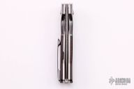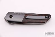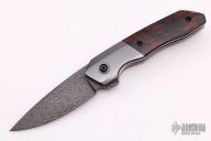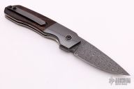 This Gent by Chad Nell features a Devin Thomas Spirograph Damascus blade with notched flipper. The handle has zirconium bolsters with titanium pivot collars, desert ironwood burl scales, zirconium backspacer and tip up clip. Rides on bearings, nice detent, lockup and blade seating. Comes with zippered case and COA. Excellent Condition.