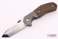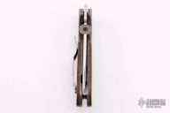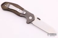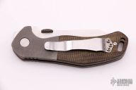 This custom Bulldog features a satin finished chisel ground blade, dovetailed bead blasted titanium bolsters, and green micarta scales. Blade has new Specwar Knives logo. Stainless steel clip, tip up carry. Has thumb disc and notched thumbrest. This knife was De-Waved at the factory in 2015. Has some scratches, very tip is rounded, otherwise good condition.