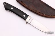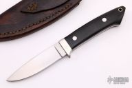 This fixed blade from T.W. Downing features a nearly mirror polished drop point blade, .130" blade stock and .938" blade depth, full tang construction. The handle is comprised of a nickel silver guard with black canvas micarta scales, lanyard tube in pommel. Includes a brown leather sheath with belt loop. Has some light scratches, otherwise good condition.